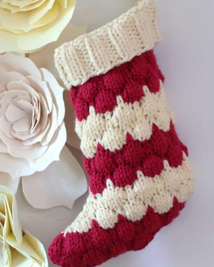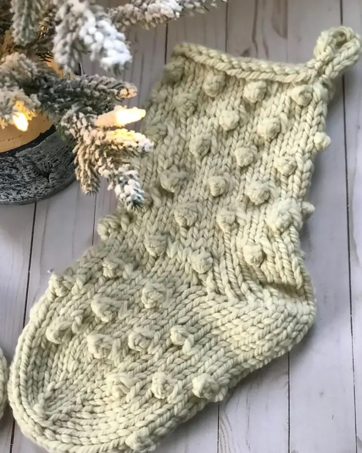 Flex your knitting skills by learning to make this exquisite Bubble Christmas stocking! It features a whimsical, textured holiday decor with super bulky yarn and an intermediate-level project. The final measurements are 18” long and 8” wide.