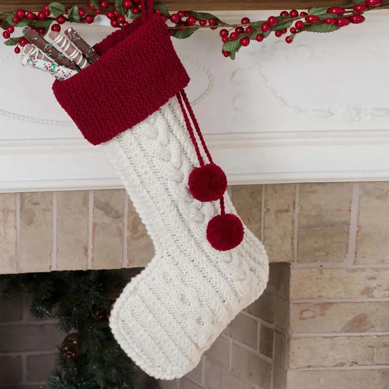 Learn to knit this one-size-fits-all design that is an intermediate-level project. It’s a vintage-inspired stocking pattern that includes cables with pom-pom embellishments.