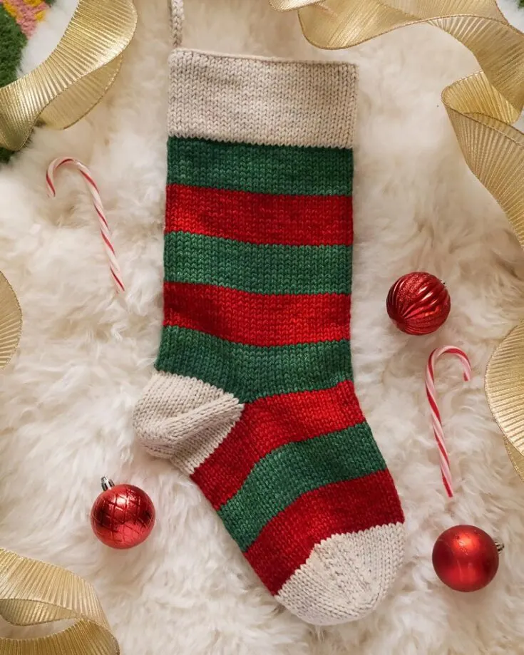 Have a look at this simple knit project that is beginner-friendly, making it ideal for newbies to try. The size of this stocking is given in the downloadable PDF; however, feel free to adjust it to fit your desired outcome.