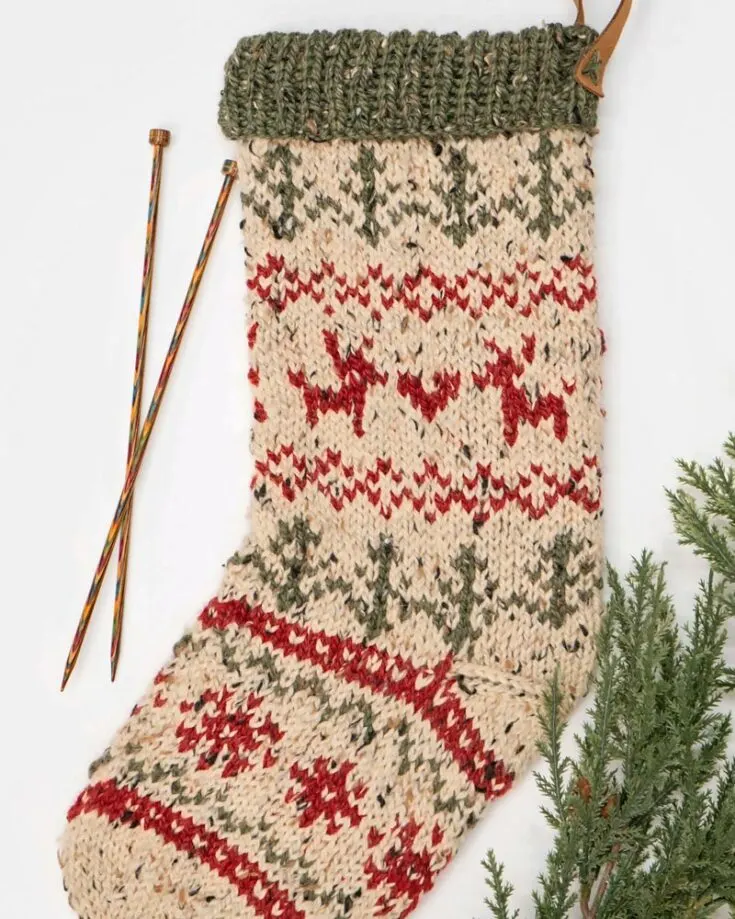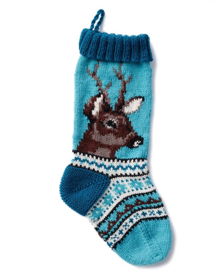 Take a look at this gorgeous Reindeer-inspired stocking! It uses the Fair Isle knit technique, making this project an intermediate-level one. The size of this stocking measures 7.5” wide and 16.5” long.