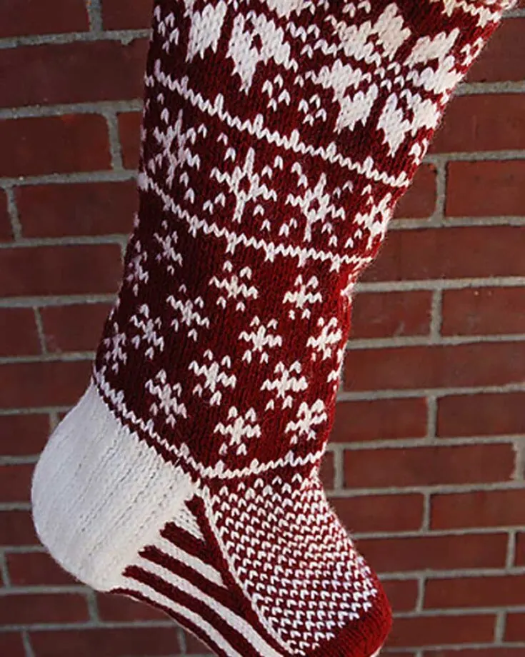 Here’s another intermediate-level stocking that emanates the joy of Christmas. It’s a pattern made with the stranded colorwork technique and adorned with fair isle motifs. The finished size is 16” from the cuff to the heel, 11” long, and 7” wide.