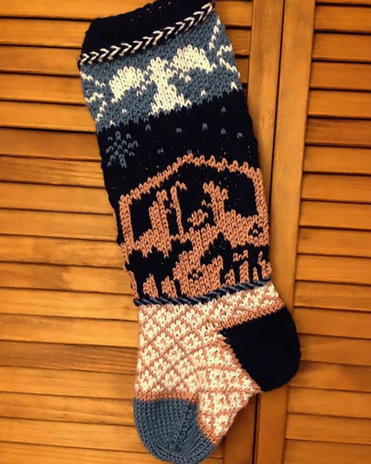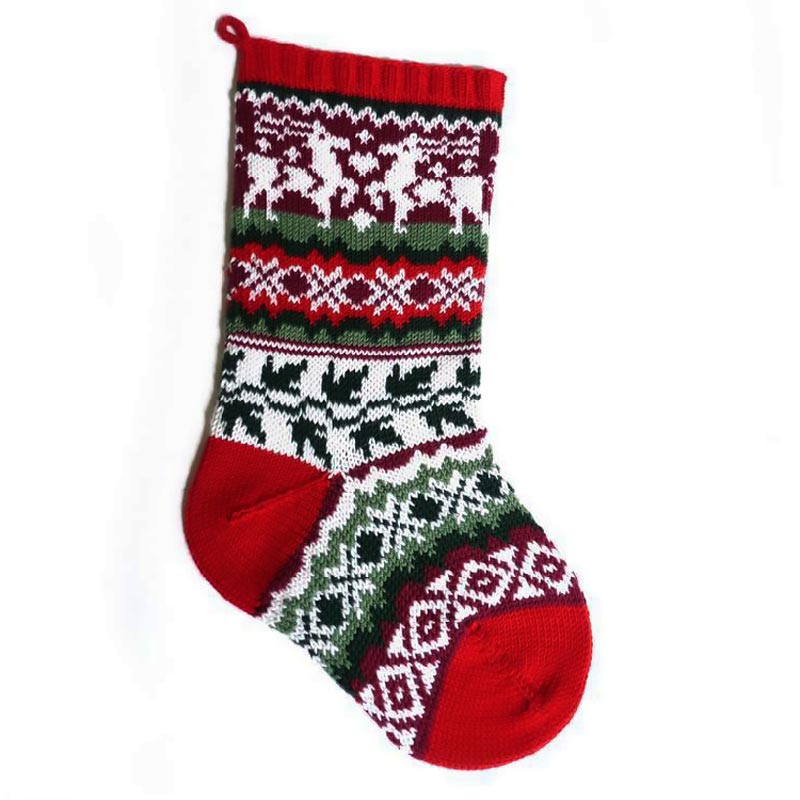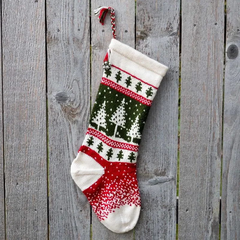 Check out this intricate stocking that is inexpensive on Etsy, which features snowy trees and Scandanavian-style details. It’s a design fit for intermediate knitters, and the finished size is 7” wide and 20” long.