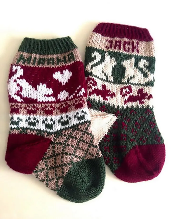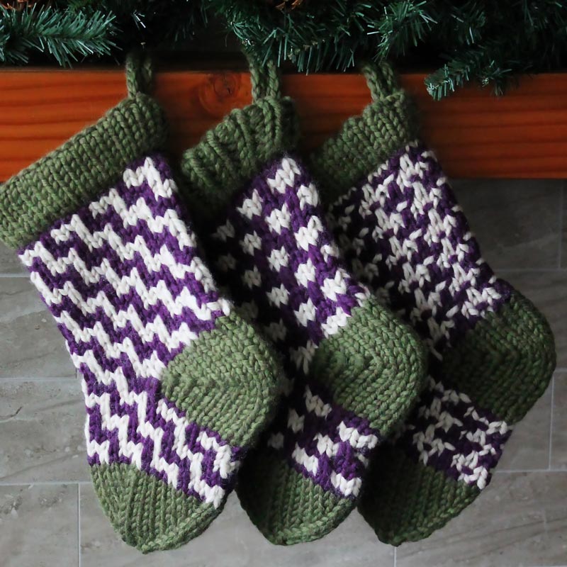 Here’s a pattern that is perfect for personalization! These stockings are an intermediate-level knit project, and the pattern comes with instructions for three different slipped stitch colorwork and folded cuff options.