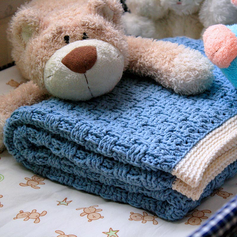 This pretty baby blanket uses a basketweave stitch pattern that resembles the texture of a wicker basket. This is an intermediate-level pattern that yields 42″ wide, 33″ long baby blanket.