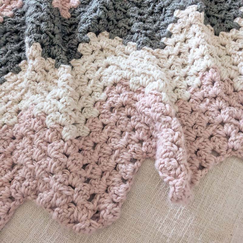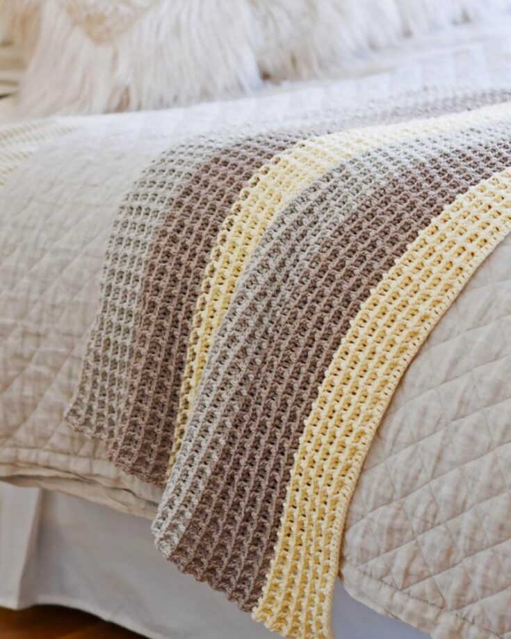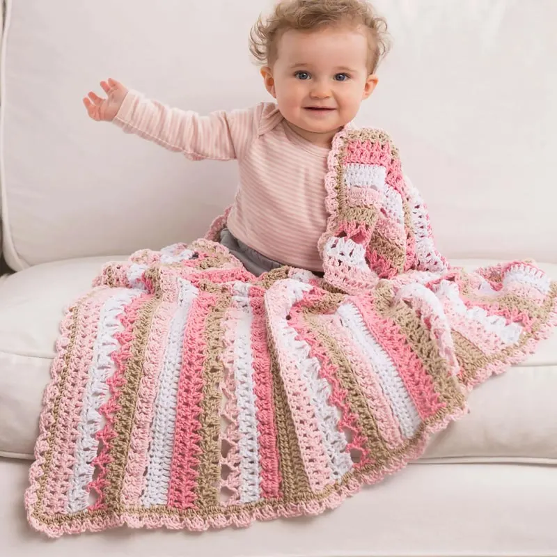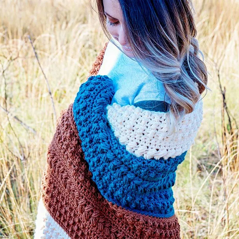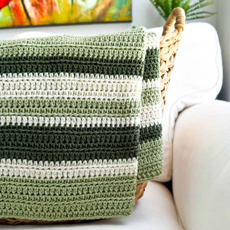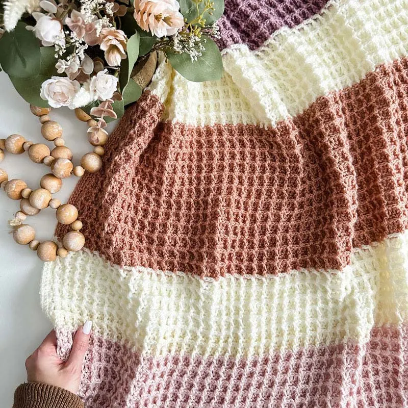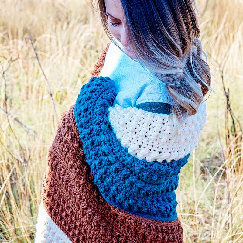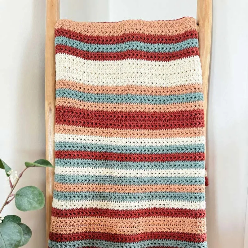 This lovely striped blanket has a beautiful stitch that gives off texture and a beautiful drape. It's an easy-level pattern with the following sizes: Baby, Toddler/Lap, Throw, Twin, Queen, and King.