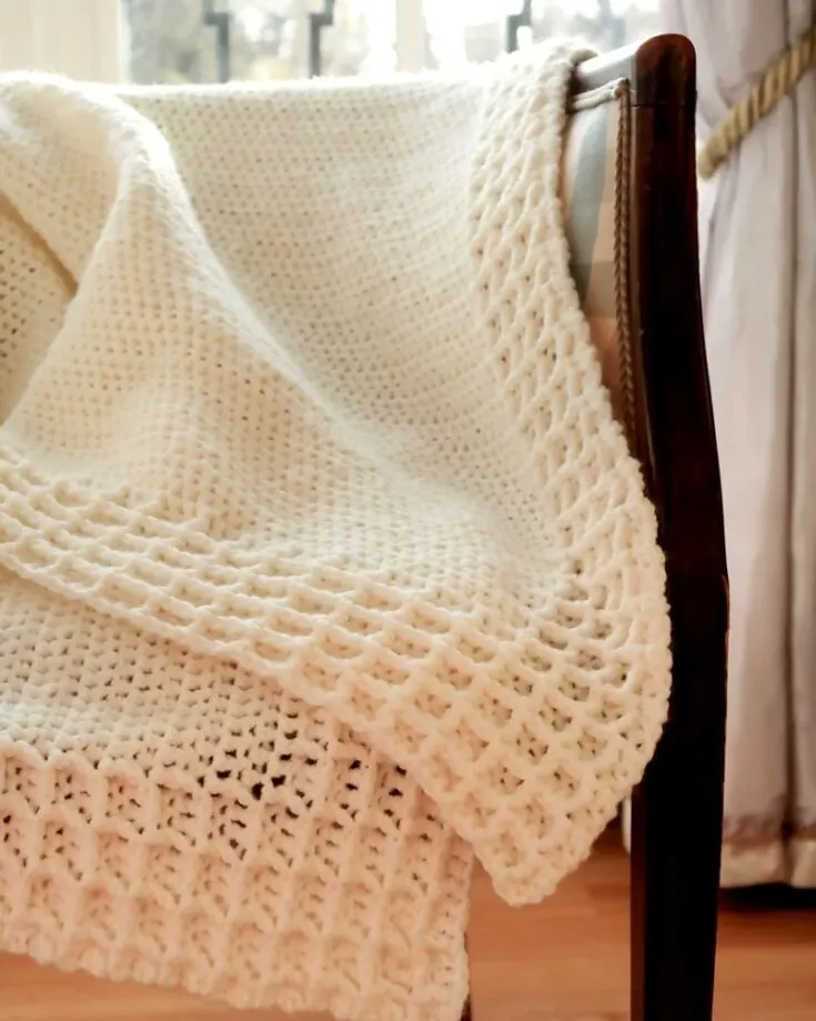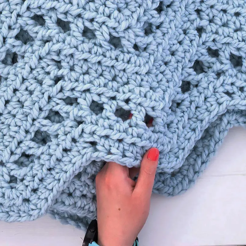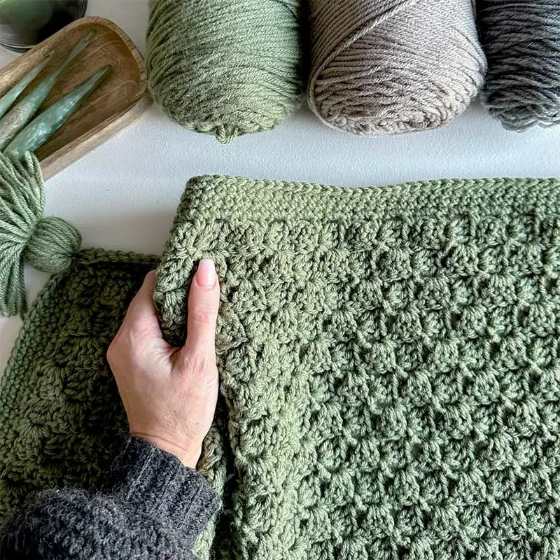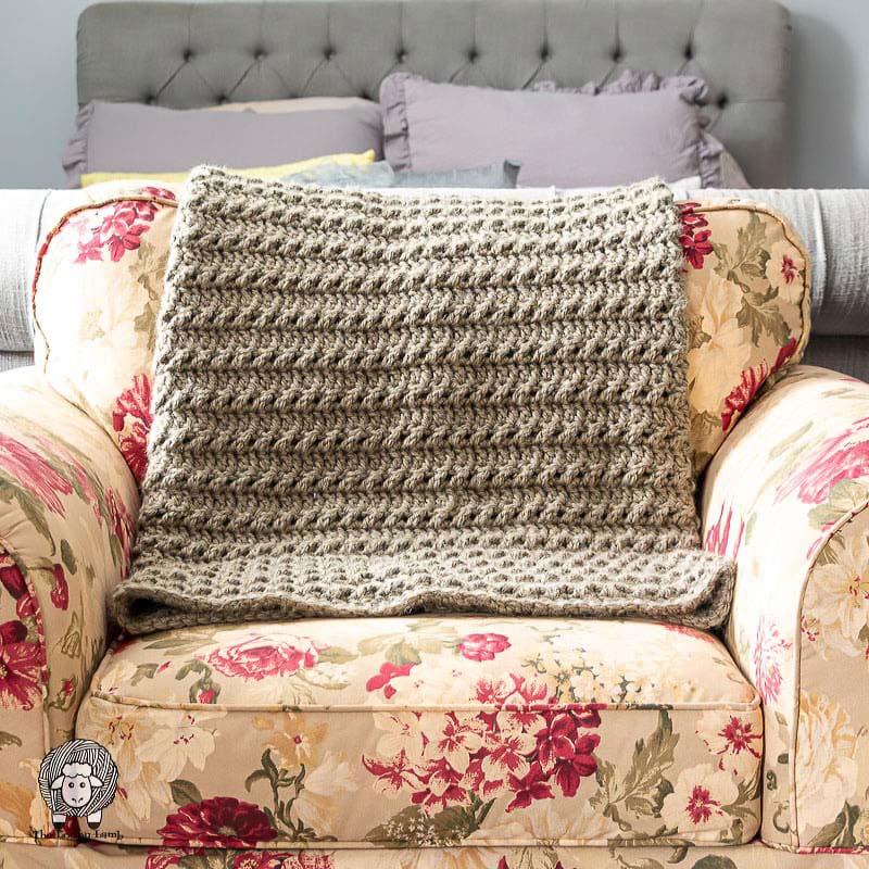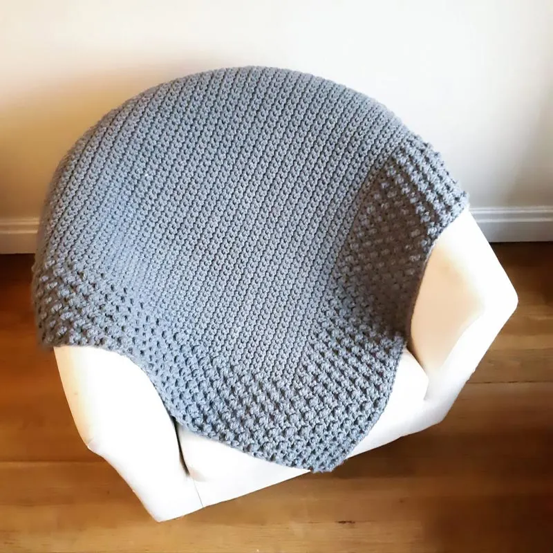 This chunky blanket is a breeze for those familiar with basic crochet stitches. Its unique texture comes from a variety of stitch patterns, which might be a bit challenging for brand-new beginners. The finished blanket measures 32” x 42”.