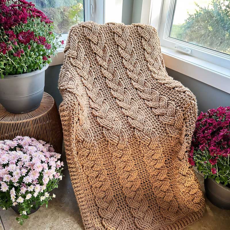 Looking for a cozy touch of luxury and warmth? This rustic chunky throw features a gorgeous cabled texture, blending cables with single crochet stitches. Perfect for intermediate-level crocheters, it measures 52″ x 58″, including a 2″ border.