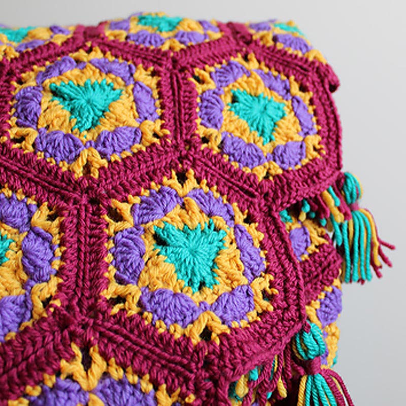 Crochet a bunch of hexagon motifs and arrange them in a beautiful diamond shape, along with tassels that give the blanket a luxurious feel. Inspired by Morocco, the exotic colors will definitely brighten your furnishings.