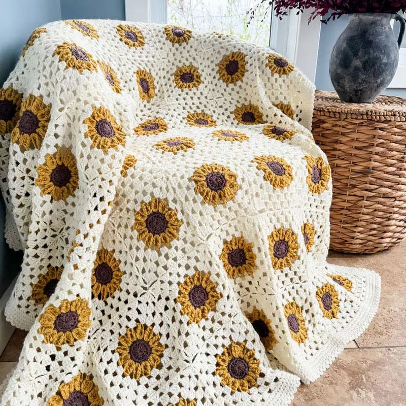 A sunflower granny square blanket is a heartfelt project that’s well worth the effort! At 52″ x 59″ (including a 3″ border), it’s an intermediate-level pattern that blossoms into a cherished keepsake to enjoy and pass down for generations.