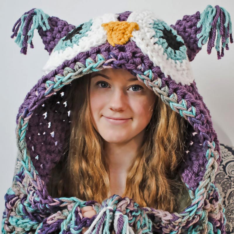 Wrap yourself in a cozy hooded owl blanket that transports you to a warm wonderland! This crochet pattern features a beautiful shell stitch design and is available in toddler, child, and adult sizes.