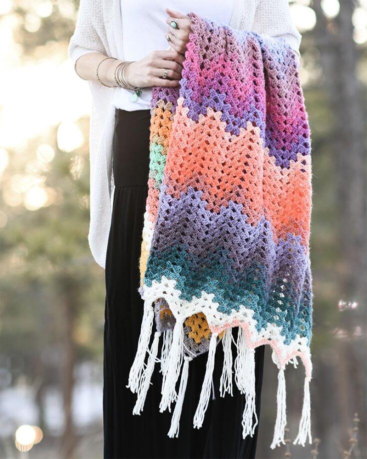 This is a simple crochet blanket for adventurous beginners, as it comes with a stitch tutorial for the granny ripple stitch. A fun piece in remembrance of summer.