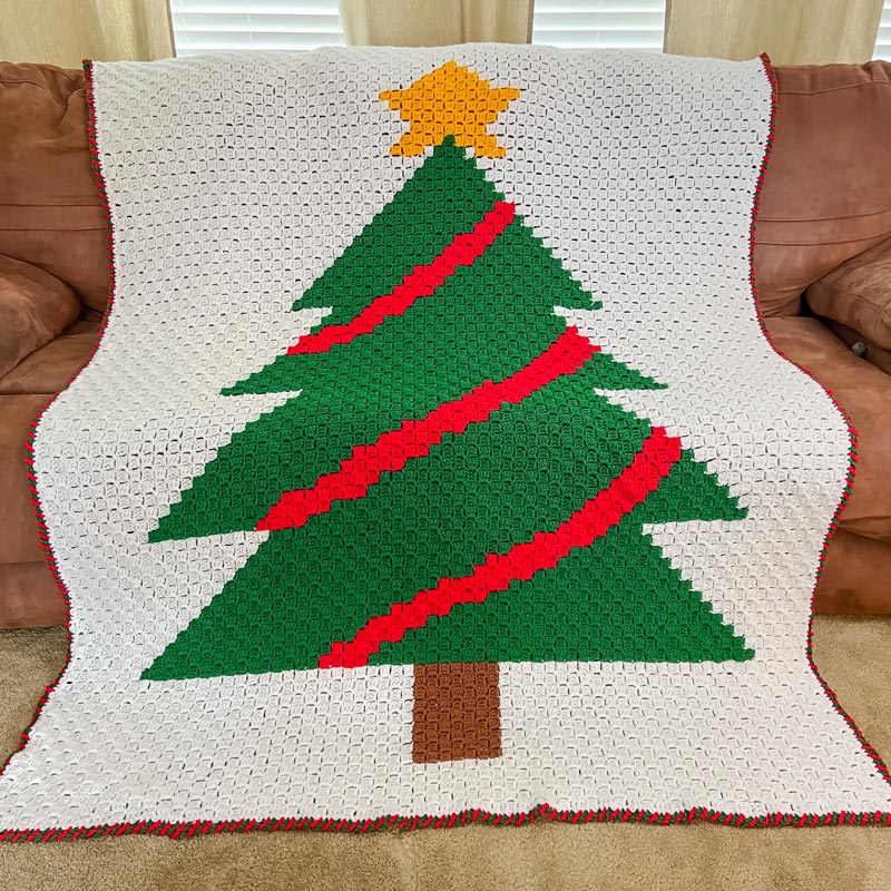 To make this Christmas Tree blanket that will keep you warm for the chilly season, you will need to know how to do the C2C crochet technique. This intermediate-level blanket is approximately 72" x 56" with a lovely festive candy cane border.
