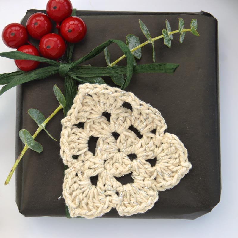 This is a beginner-level pattern written in UK terms to make a 14.5cm (w) by 14cm (h) Christmas applique, great as a deco on its own or as a crochet Christmas ornament. Give it a shot!