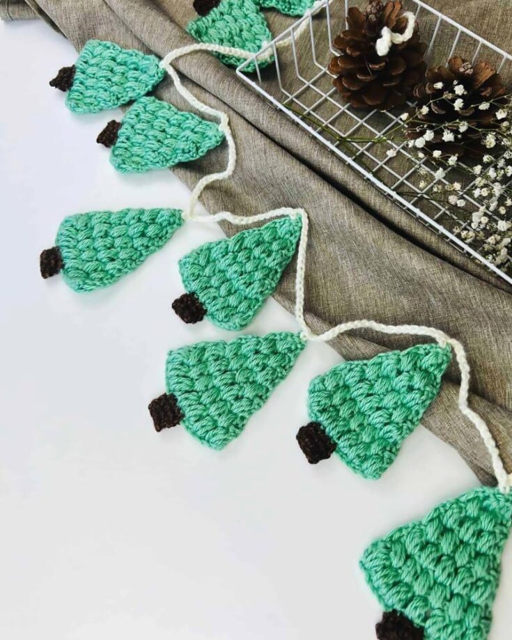 Since it only takes 15-20 minutes to make each tree, you can easily finish this entire garland in just a few hours! You can add other flat Christmas appliques to this design and alternate between the trees with crochet stars, crochet Santa Claus, and many more.
