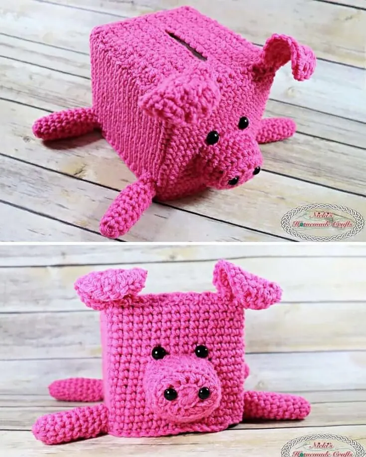 The piggy bank crochet pattern uses basic stitches that will be easy to follow, even for beginners. It's a practical project that will allow you to reuse an empty tissue box to encourage saving.