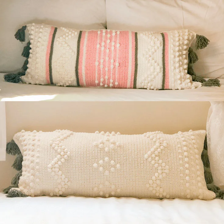 This unique Anthropologie long pillow adds color, texture, and comfort to your room! This crochet pillow cover is suitable for beginners to intermediate crocheters. The pattern calls for single crochet, bobble stitch, and mini bobble stitch.
