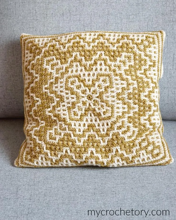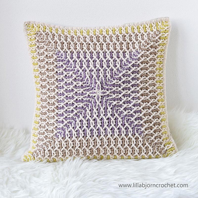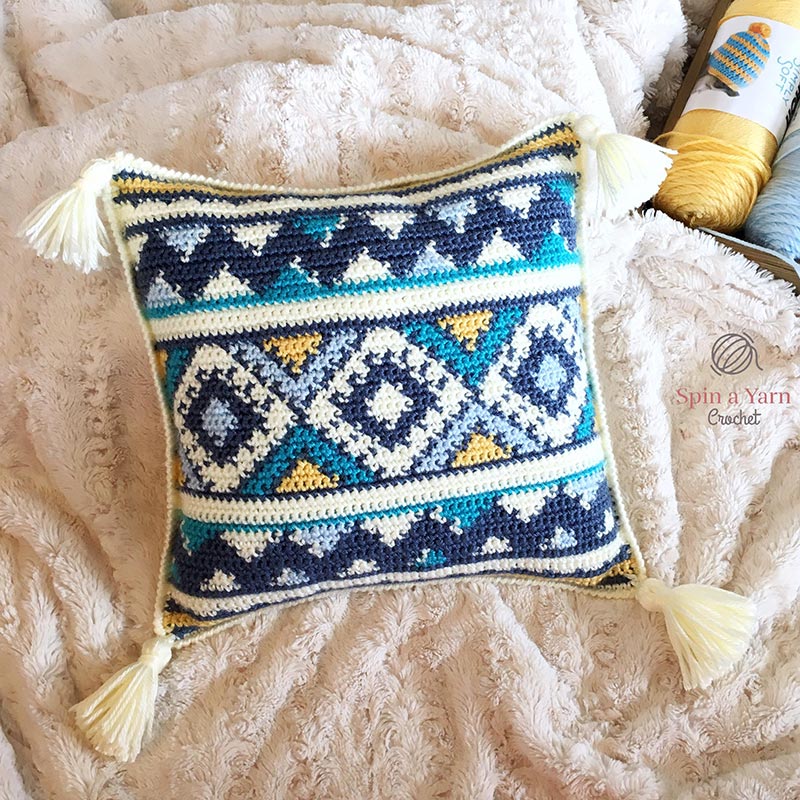 This Aztec pillow is another great design that will stand out on your plain old sofa. It creates a lovely colorwork design using tapestry crochet and basic stitches. The crab stitch (basically a single crochet worked from left to right instead) added a special touch to the border.
