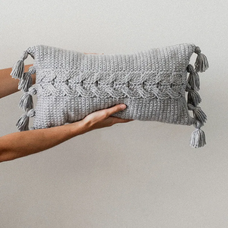 This lovely pink pillow has two textures on opposite sides! The lighter pink side features a sophisticated hourglass cable. The darker pink side, on the other hand, is made from a chisel stitch, which is a lovely twist on a basketweave stitch. Due to the complexity of this cover, an intermediate or higher level is recommended!