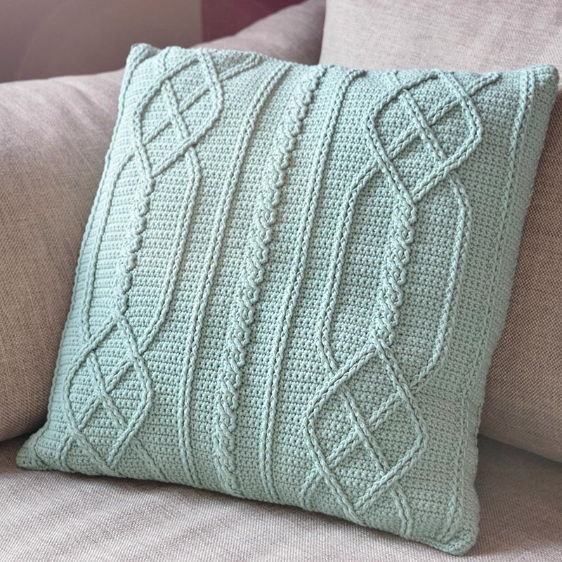 This unique Cable Diamond Pillow is inspired by the look of knitted cables seen in many sweater designs. It gives a contemporary twist to the traditional cable texture. This is an intermediate-level crochet pillow cover because it requires front post double crochet and front post treble crochet.