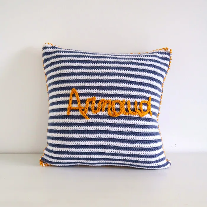 This is a great way to personalize a pillow for yourself or your newborn. It's also a simple but thoughtful gift for any new parents out there. All you need is a basic understanding of the single crochet stitch and the chain embroidery stitch.