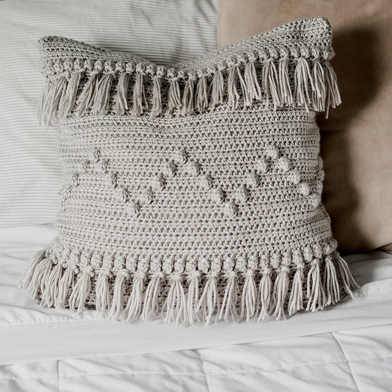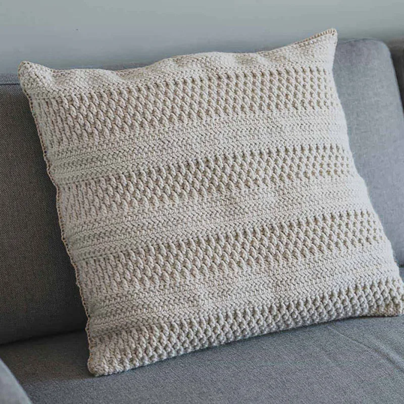This farmhouse-style pillow takes the bobble-striped blanket trend and turns it into a smaller, more manageable project! It is made with bobble stitches and herringbone half double crochet.