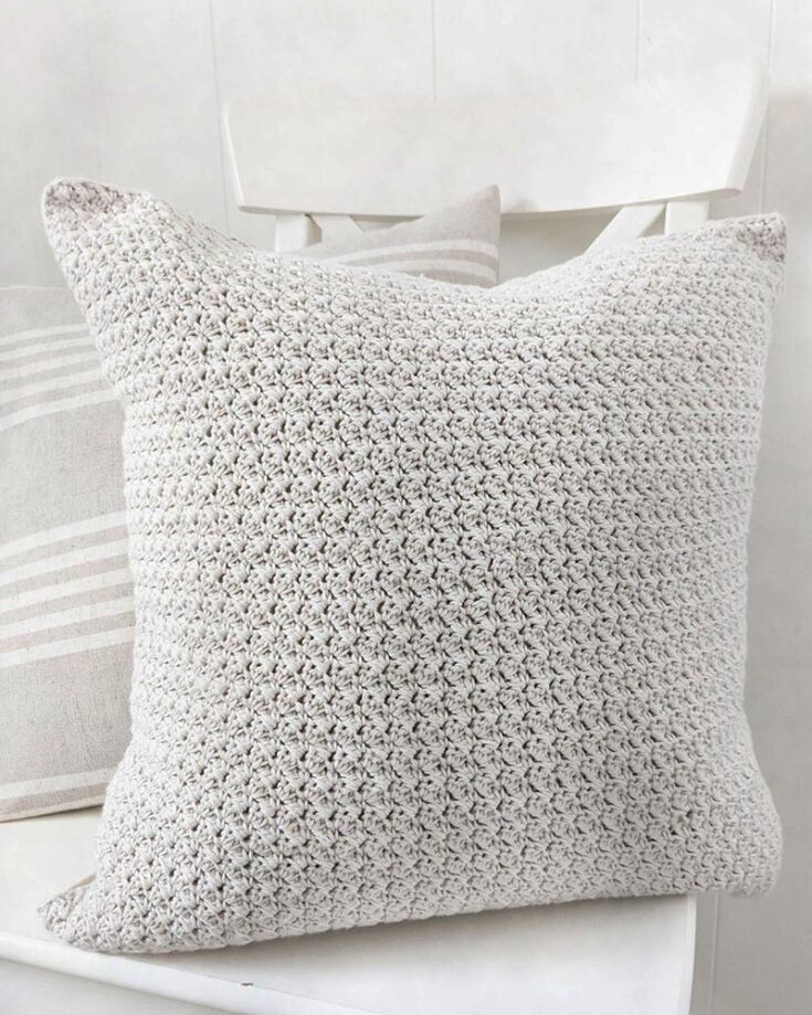 This crochet pillow pattern teaches you how to crochet an aligned cobble stitch in a square. This pillow pattern makes use of bulky yarn, making it a quick project that also highlights the cobble stitches nicely.