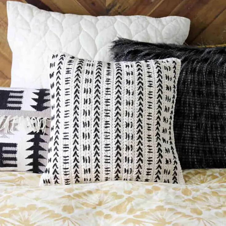 The inspiration for this crochet pillow came from the mud cloth design. Do you know what a mud cloth is? It's a Mali-made African fabric that has been dyed with mud to create a beautiful tribal graphic. You can complete this pillow cover as long as you know how to make single crochet stitches.