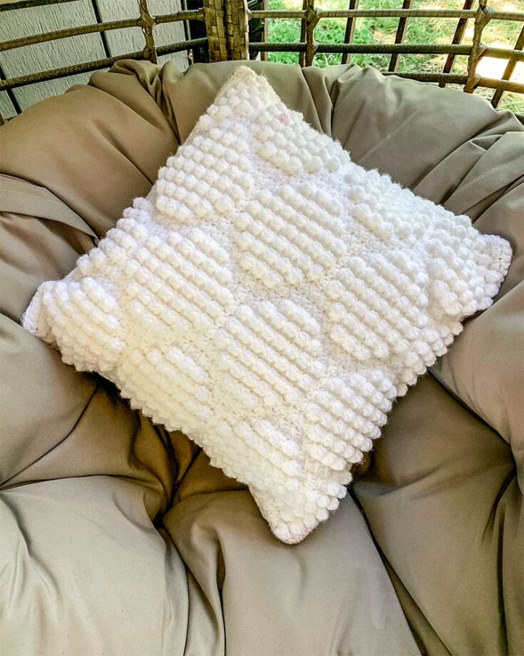 This pattern will show you how to crochet a pillow with bobble stitches and post stitches. These really give this crochet pillow cover a lovely pattern that fits the texture trend perfectly.