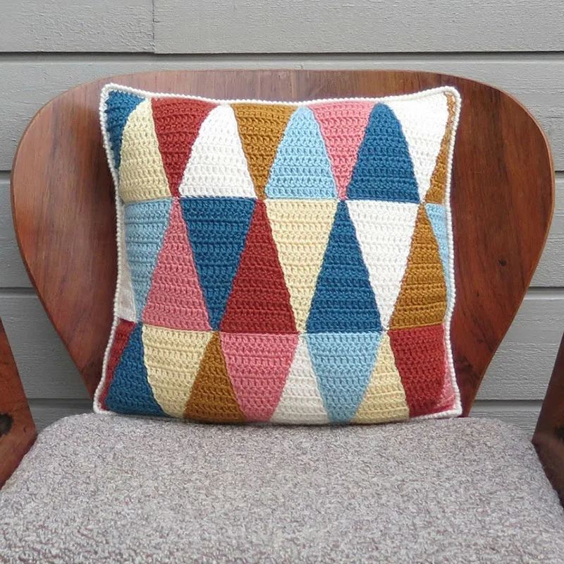 This stunning mosaic crochet pillow can be made in eye-catching color combinations that complement your home decor perfectly. The front of the pillow cover is made using the mosaic crochet technique, which is worked in rounds. The reverse side is made entirely of single crochet stitches in one color. It also has a buttoned opening where you can insert your pillow form. This project requires intermediate-level knowledge to complete.