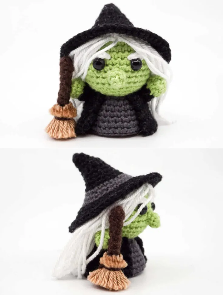 For a smaller not so complex evil witch crochet pattern, this one's perfect for you! This pattern only uses chain, single, double, and loop crochet stitches so if you've mastered them all then this witch should be a piece of cake. I love that they included a face on this lil' witch making this one of the rare amigurumi Halloween crochet patterns of witches with faces!