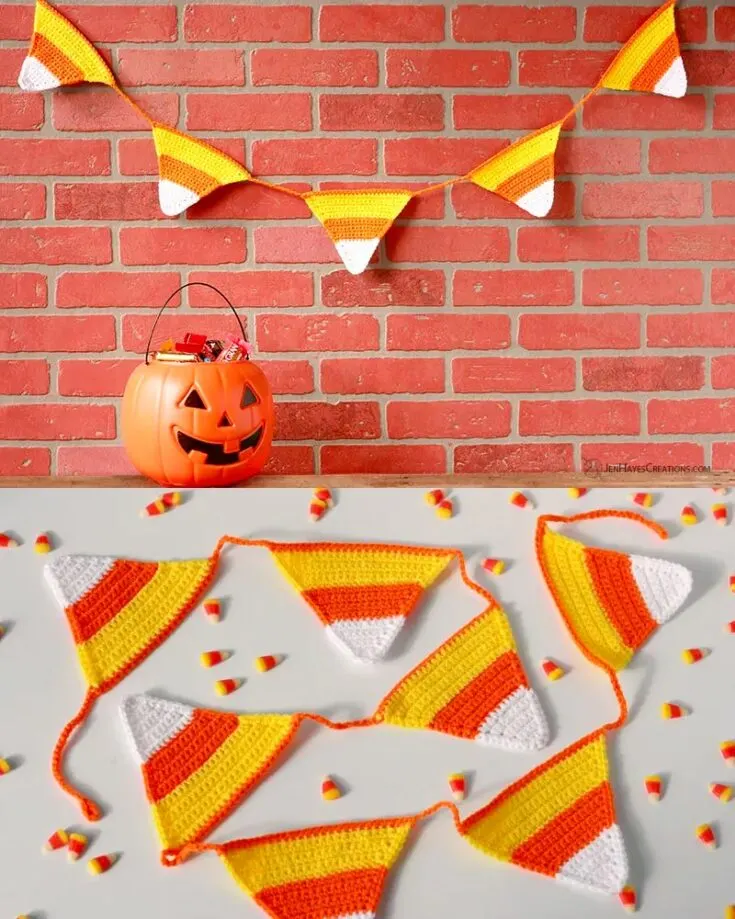 This crochet candy corn bunting is a simple anbd easy Halloween decoration. Great for those who are short of time.