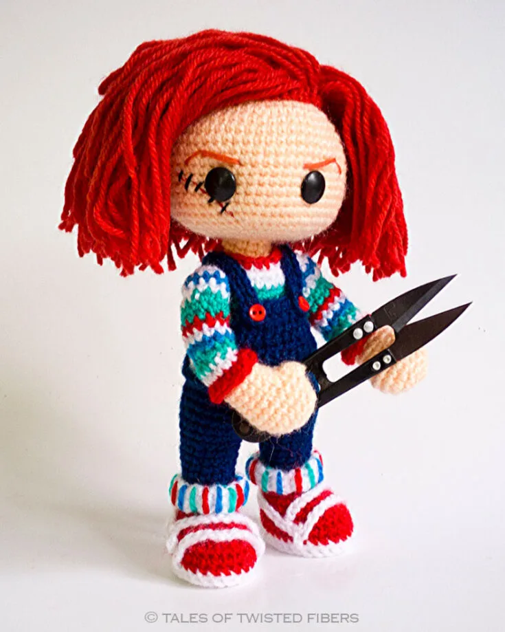 Right out of a horror movie, this Chucky doll is bound to scare away all your guests for sure! Inspired by the doll Chucky, the strips on his Converse shoes and the scars on his face are just some of the intricate details on this doll. This pattern requires you to have some embroidery skills and a lot of patience to crochet and sew all the small pieces together.