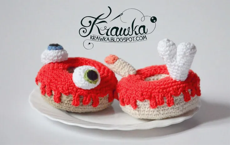 Here is another sweet treat crochet pattern! Available for download, this post offers you two crochet patterns, one is a regular pink donut with sprinkles and another is a spooky eyeball, bones, and all donut to pop in your Halloween basket.