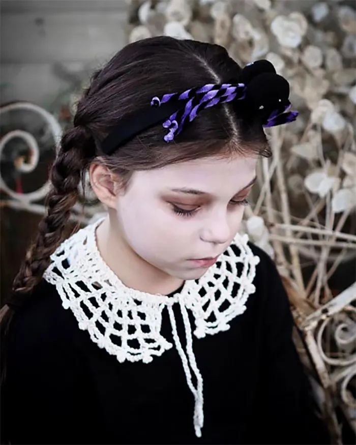 Here is another elegant way to elevate your daily clothes to a pretty Halloween costume. By adding sparkles to your threads, this Halloween collar gives a nod to the season without requiring you to go all out. This web collar can be worn both ways too.