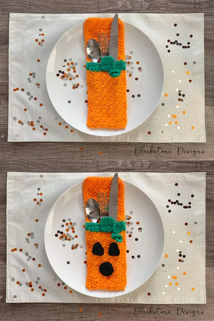 This Pumpkin or Jack O’Lantern Flatware Holder crochet pattern holds your flatware in neatly whilst bringing the holiday cheer to the dining table. Festive yet practical. This crochet pumpkin pattern is a beginner-level project so get your crochet hooks going!