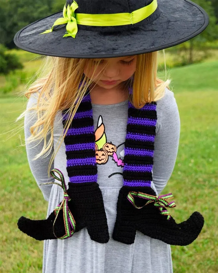 Perfect for a chilly night out trick-or-treating or to just spice up your everyday wardrobe for Halloween, this witch legs scarf has got you. The tutorial comes in both adult and child sizes so you can your kids can be matching this Halloween!