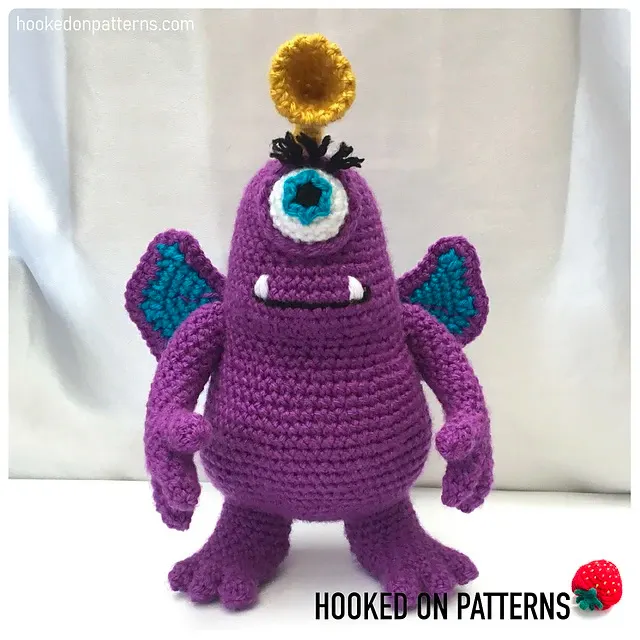 This Purple People Eater crochet pattern uses Bulky (UK Chunky) weight and is recommended for intermediate level and above due to the more complex separate parts. Although not one of the easy Halloween crochet patterns, this one-eyed, one-horned flying cutie will be a great addition to your Halloween decor!
