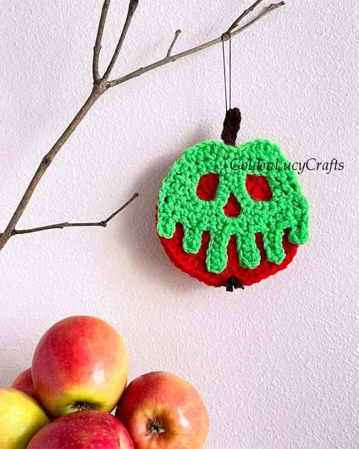 This poisoned apple ornament has a unique twist as the poison leeching off the apple looks subtly like a Jack-o-lantern face! You can make them as stand-alone pieces to hang on doorknobs or you can string them together to form a Halloween garland.