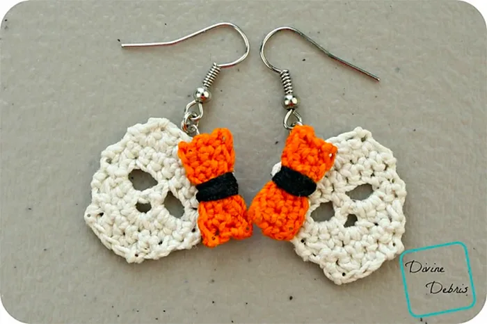 These skull earrings would go well with the web collar pattern mentioned above. A fabric stiffener is required for this small craft as it keeps your crochet pattern in shape and visible when dangling from your ears.