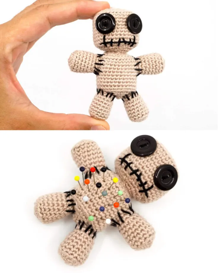 Now this is not a pattern we see often. This unique voodoo doll can be made using only single crochet stitches in spiral rounds with some increases and decreases so it's really a great doll for beginners to have a go at. A little bit of sewing work is required to create the stitched-up look and attach the eyes but follow along with the free guide and you'll have your voodoo doll in no time!