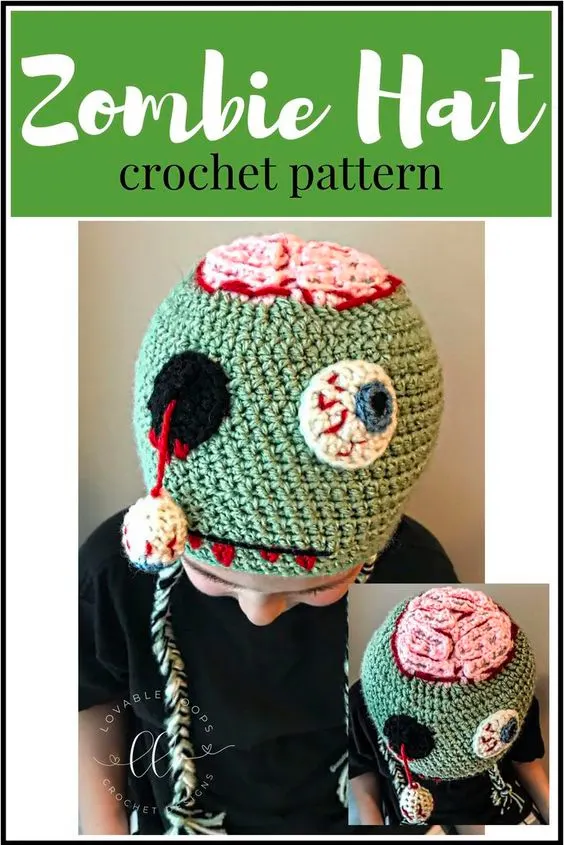 Looking for something to wear as a costume this Halloween? Look no more as this Zombie hat crochet pattern will truly wow at every door you knock at. With the brains protruding and an eyeball hanging by an artery, this zombie hat is full of spooky details.