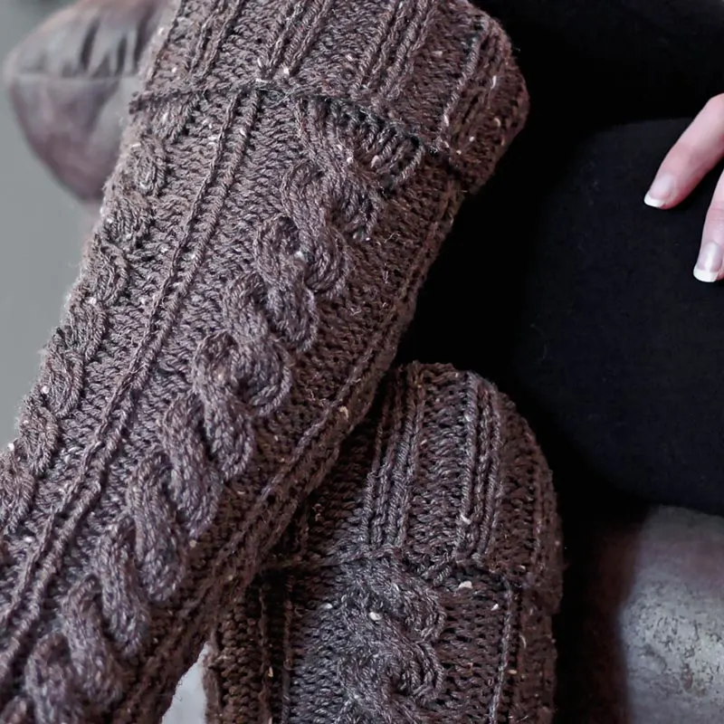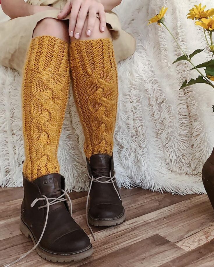 Try knitting these advanced-level leg warmers that are a maxi pattern, and they are thigh-high. This design is made with superfine/fingering-weight yarn that will keep your leg warm all season long.