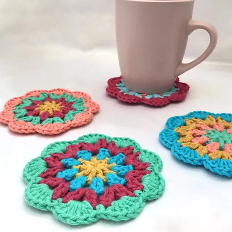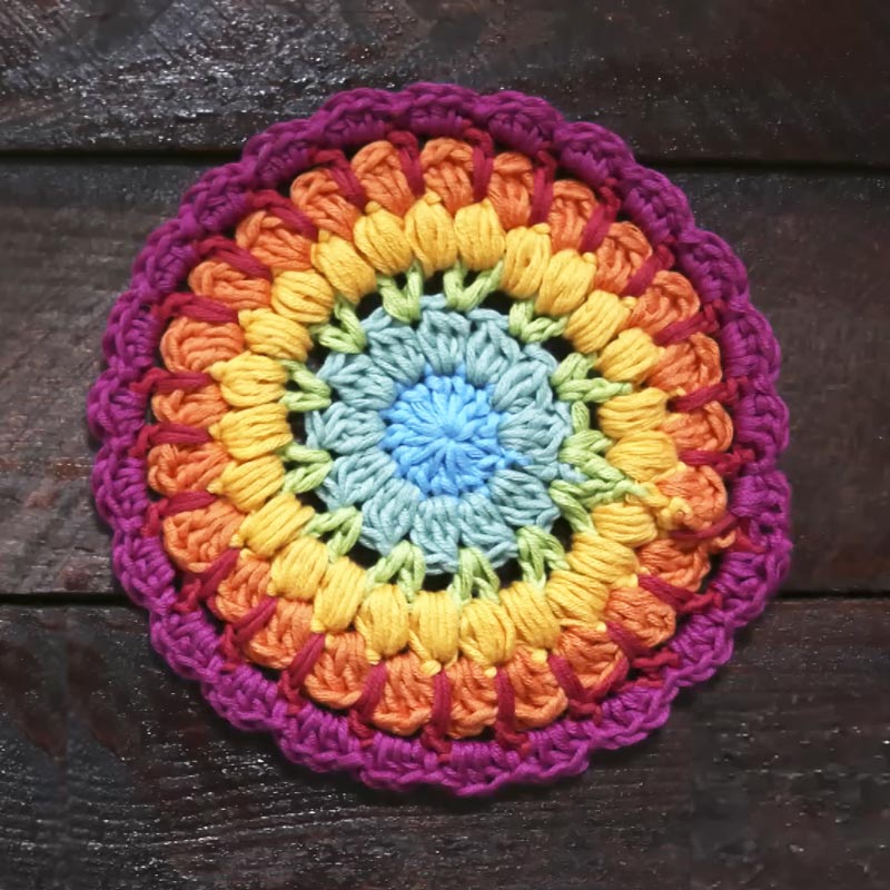 Great as a stash buster, use all the vibrant, colorful, leftover yarn scraps by matching them together to create these lovely yet practical mandala crochet coasters.