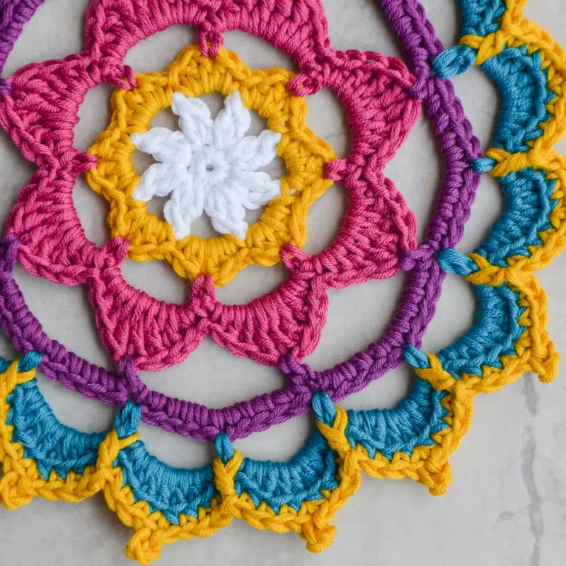 Contrary to its name, it is not just another mandala; it may be the one you fall in love with, and you can't wait to grab your crochet hooks to make one for yourself. Many basic stitches are used to make this, so fear not and give it a go today.