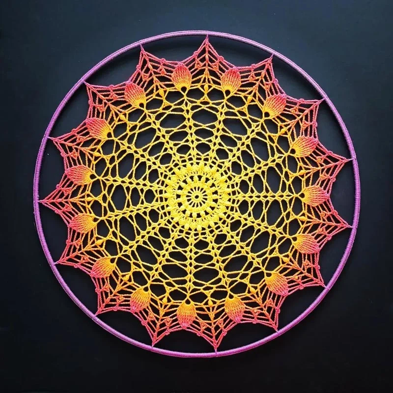 Crochet mandalas are quite similar to crochet doilies, and the terms may be used interchangeably. Mandalas can be said to be lace doilies that have received a 21st-century update! However, mandala patterns differ from crocheted doilies as they are more solid, whereas doilies are often more finer, delicate, and lacy.