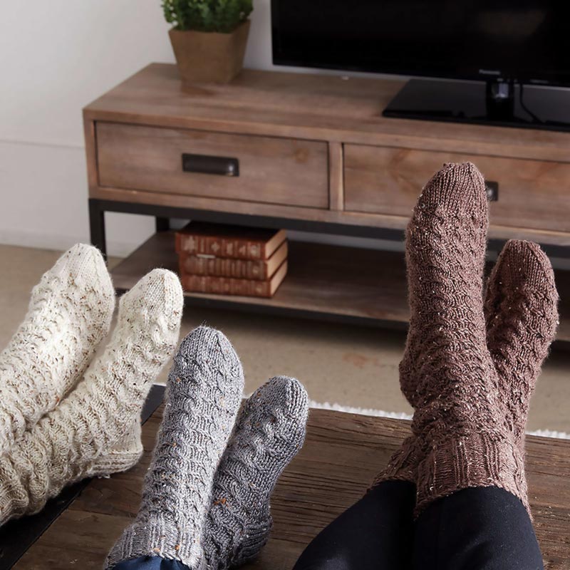Knit these lovely pair of socks with neutral tones and a cabin feel! This intermediate-level project is filled with rustic charm and is knitted with double-pointed needles. It comes with instructions for Eur sizes 34, 38, and 42.