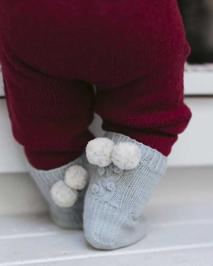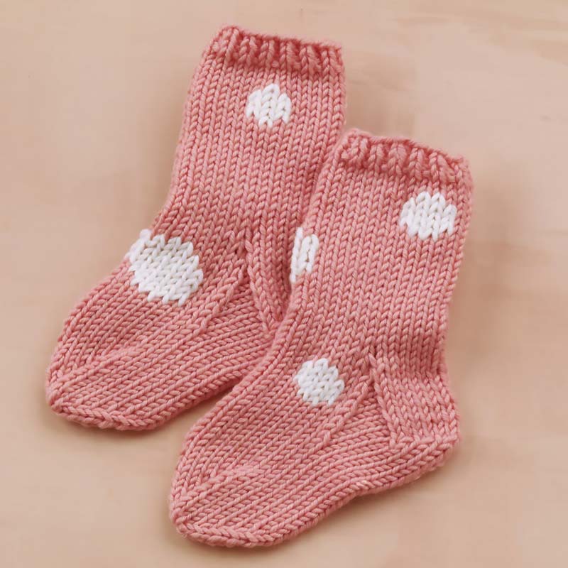 Warm up your little one's tippy, tappy toes with these adorable, intermediate-level socks. It's a Dutch heel pattern adorned with small pompoms that add a cute flair to the knitting socks. It's one size only, but feel free to alter it to fit your kid's size.
