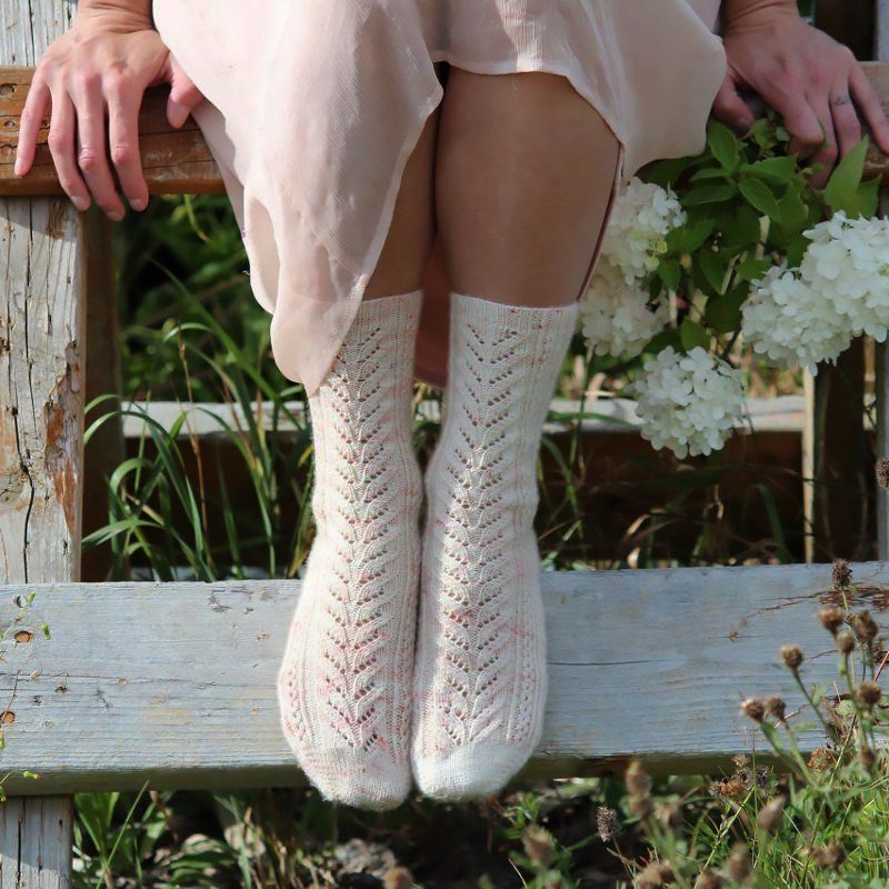 Check out this adorable sock pattern! This intermediate-level knitting project is a flat toe and cuff-down design that uses the stockinette stitch in the round. It's a lovely pair of socks for those who love a coquette look.
