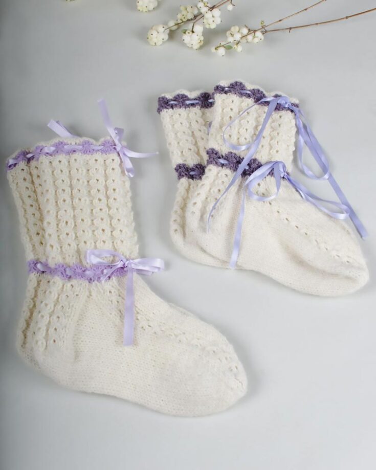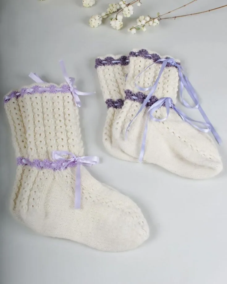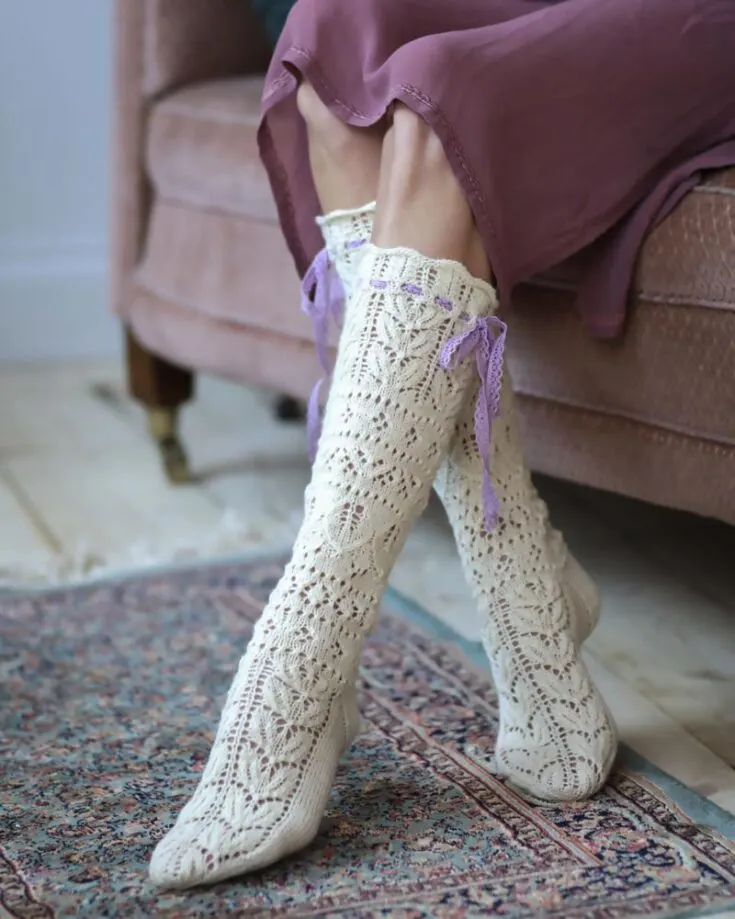 These socks are for the girls who love the coquette aesthetic! It's an advanced knit project that features a stockinette stitch and lace pattern in the round. It's so adorable and adorned with a pair of lace ribbons. The finished size fits Eur women's size 38.