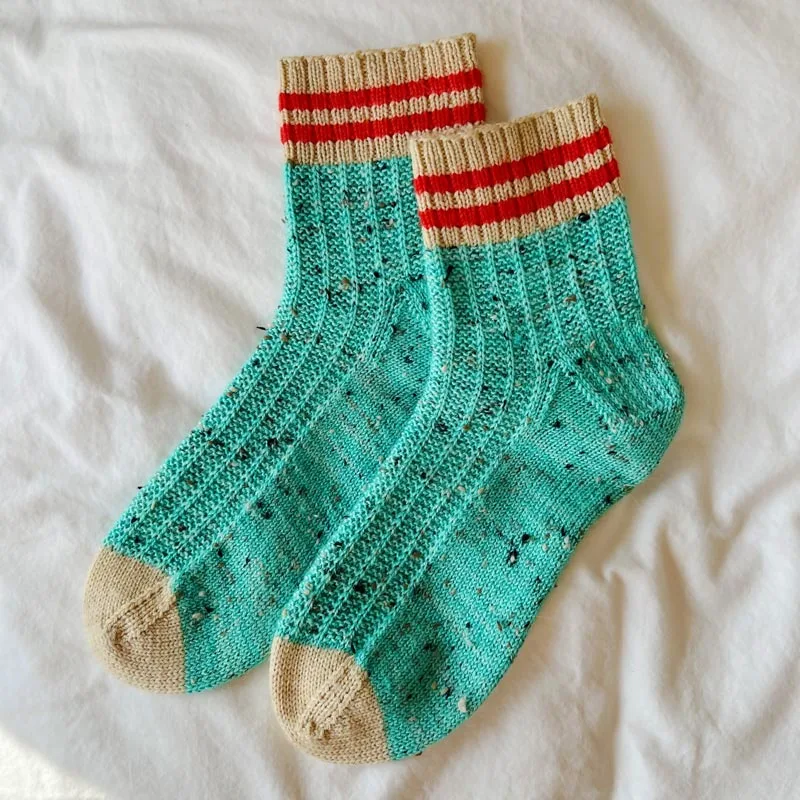 Here's another easy sock design with a cuff down, heel flap, and gusset! It's a classy and timeless unisex pattern that combines sporty stripes with a cozy texture pattern that is easy to memorize and relaxing to knit. It comes in sizes from kids to adults.